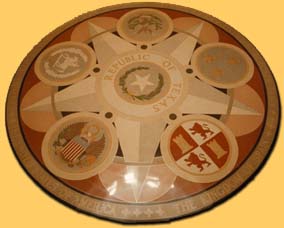 El piso de la rotonda, como la mayoría de los del Capitolio, es de terrazo. Este es un mosaico hecho con pequeñas piezas de mármol o granito empotradas en argamasa, el que se pule luego hasta que esté lustroso y brillante. Los escudos del piso trazan la historia de Texas, representando las seis banderas que han flameado en el estado. El escudo del centro representa a Texas como república, con su individual estrella blanca y ramas de roble y olivo simbolizando fortaleza y paz. Directamente debajo de este escudo está el que representa a Texas como parte de Estados Unidos. Los otros escudos representan a nuestro estado bajo el poder de España, Francia, Méjico, y a Texas como parte de la Confederación.